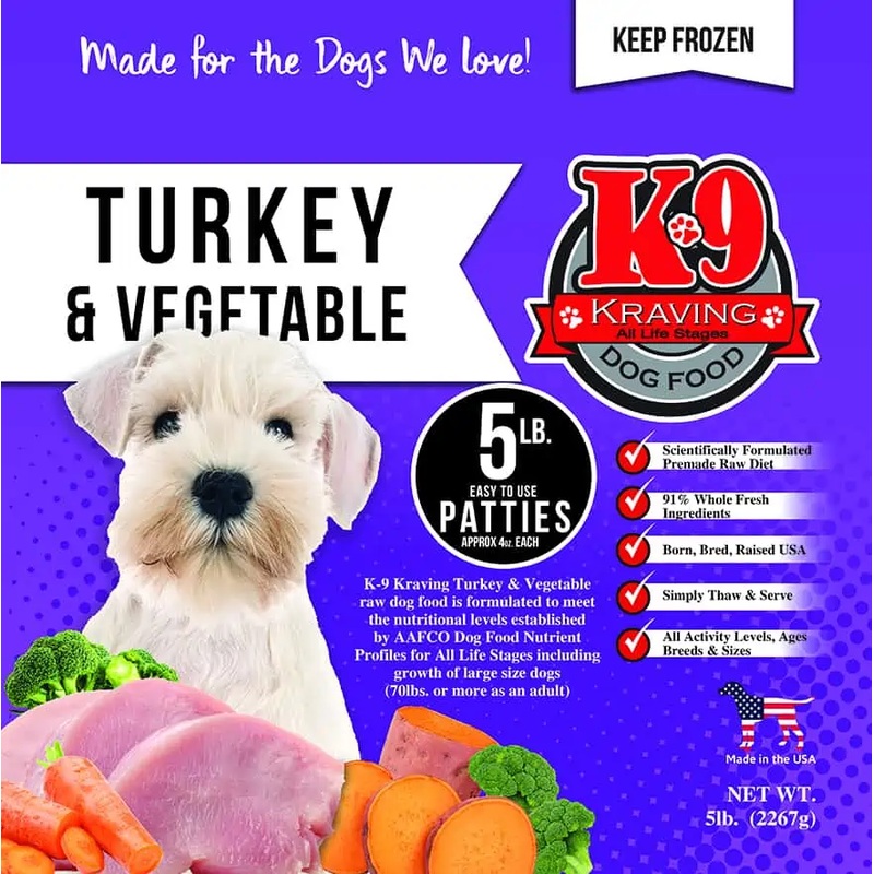 K-9 Kraving Turkey & Vegetable PattiesComplete & Balanced Diet For all life stages, including large breed puppies over 70 lbs.INGREDIENTS:Turkey Breast Meat, Turkey Organ Meat (Heart, Gizzards & Liver), Fresh Ground Turkey Bone, Fresh, Low-Carb Vegetables