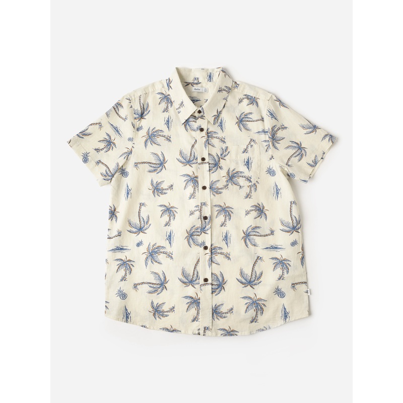 DESCRIPTION:A palm tree-printed button-down shirt made from soft garment-washed fabric.