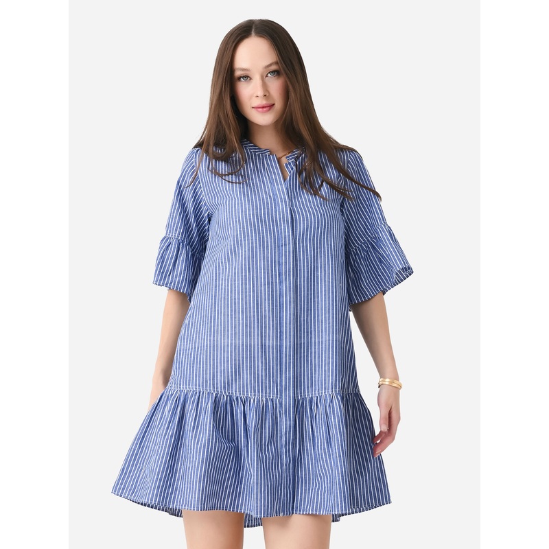 An easy-fitting striped dress featuring a hidden placket and ruffle edges.