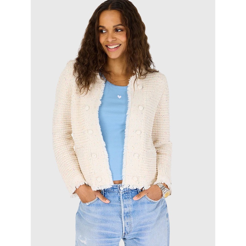 DESCRIPTION:This KR favorite, made from knit cotton, is now available in a neutral design with eye-catching multi-color specs.FEATURES:Round NecklineEmbroidered DetailsButton-Down FrontFringe TrimsKnit Fabrication100% CottonClassic Fit