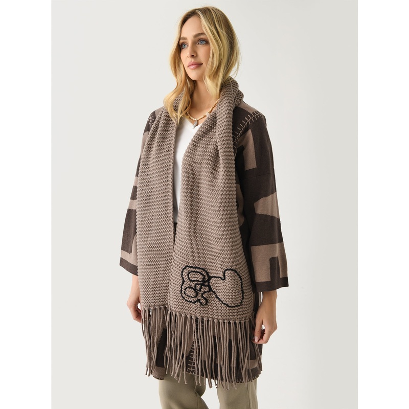 DESCRIPTION:A garter stitched scarf made from a soft cotton-cashmere blend with an embroidered custom artwork design.FEATURES:'And Love' ArtworkFringe TrimKnit Fabrication95% Cotton, 5% CashmereDimensions: 72 in. x 12 in.
