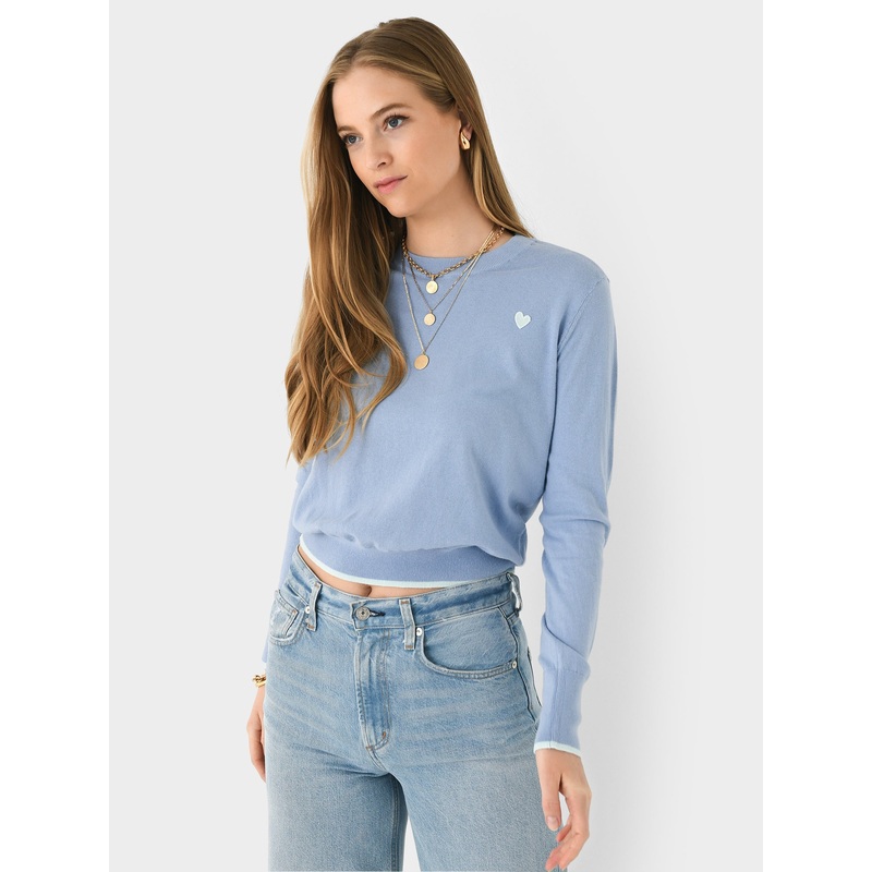 A classic crewneck sweater knit from lightweight cotton with a tiny embroidered heart and contrast tipping on the hem and sleeves.