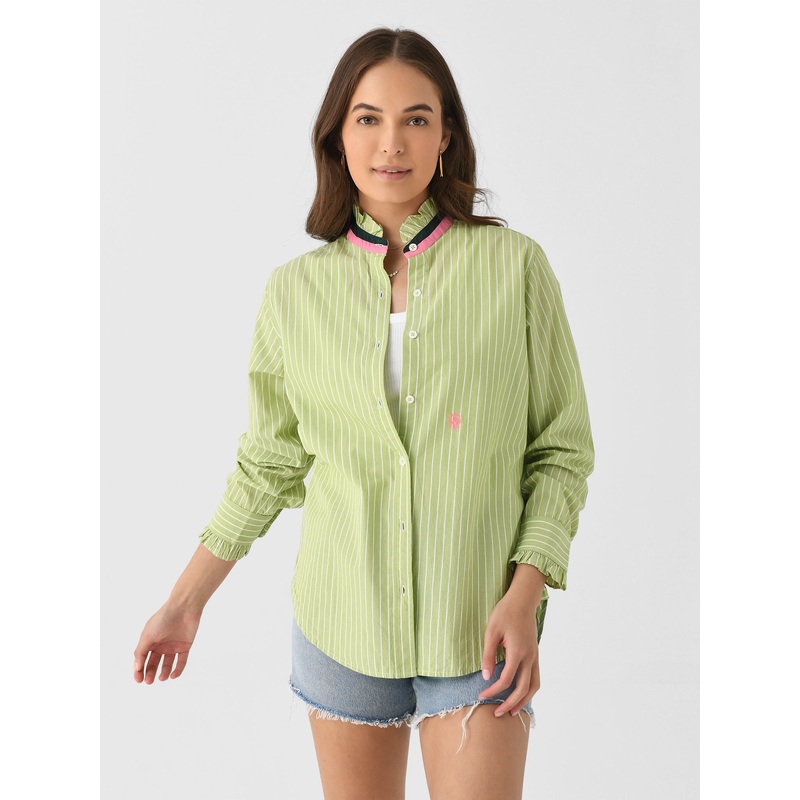DESCRIPTION:This best-selling shirt is made from lightweight cotton and features an effortless feminine design with dainty ruffle trims.FEATURES:Round NecklineButton CuffsRuffle TrimsButton-Down PlacketCurved HemEmbroidered DetailAll-Over Stripe Print100%