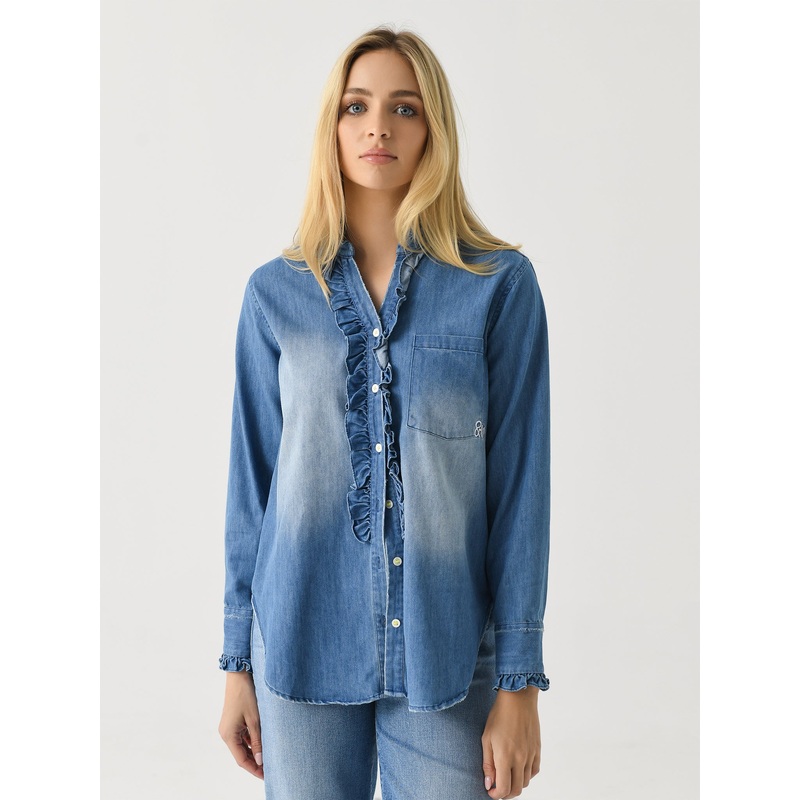 A lightweight button-down denim shirt featuring a ruffle-trimmed placket, neckline, and cuffs.