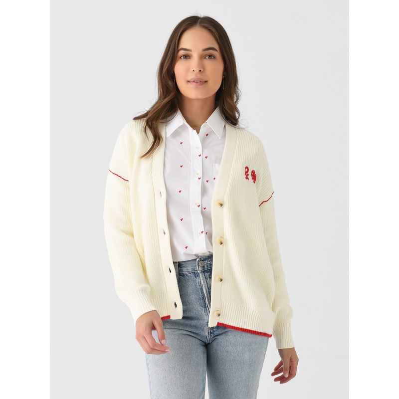 DESCRIPTION:This cozy cardigan features a relaxed, slouchy fit and charming cherry red accents inspired by Kerri's artwork.FEATURES:V-NecklineContrast GraphicDropped ShoulderButton-Down FrontRibbed Cuffs and HemKnit Fabrication100% CottonRelaxed FitModel i