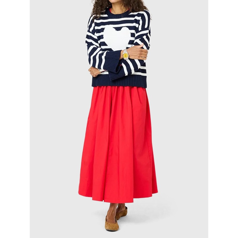 A cozy crewneck sweater made from summer-weight knit cotton featuring a striped design with an imperfect heart graphic.