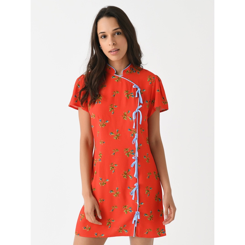 DESCRIPTION:A floral-printed mini dress with a flattering Cheongsam-inspired design.FEATURES:Mandarin CollarBack Zip ClosureSide Tie DetailsContrast PipingMini SilhouetteAll-Over Novelty Print59% Ecovero Viscose, 41% ViscoseClassic FitModel is wearing size