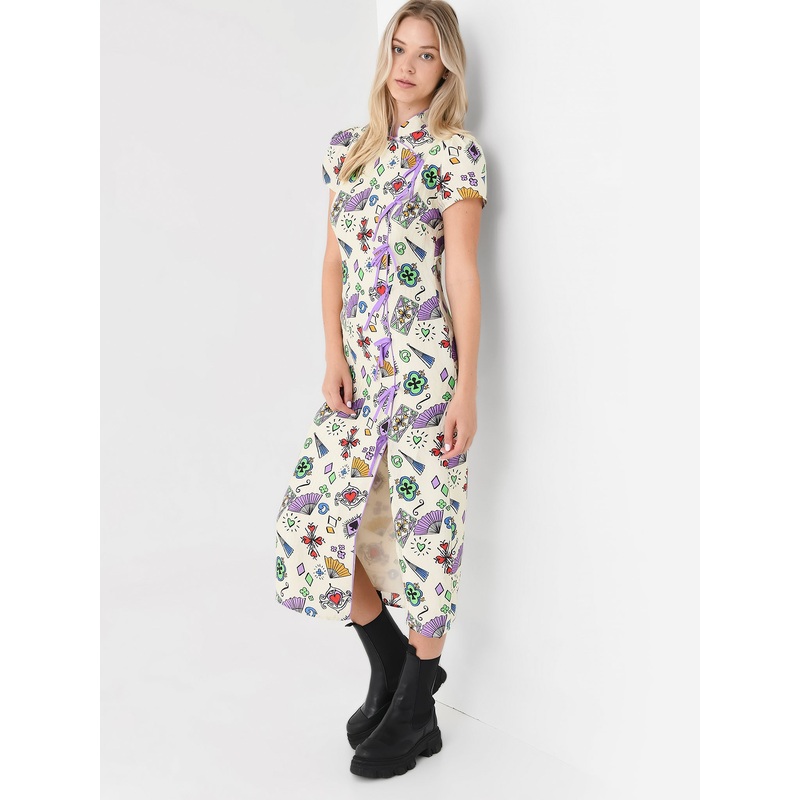 A Cheongsam-inspired midi dress with a unique novelty print and contrast piping.