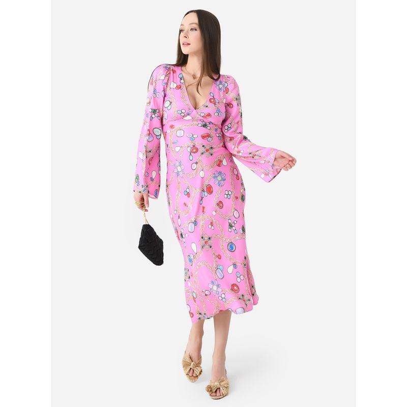DESCRIPTION:Floaty and feminine bias-cut dress with a custom chain print.FEATURES:V-NecklineFluted SleeveSide Zip ClosureBias Cut SkirtA-Line SilhouetteAll-Over Novelty PrintSatin Twill Fabrication54% Viscose, 46% EcoveroClassic FitModel is wearing size US