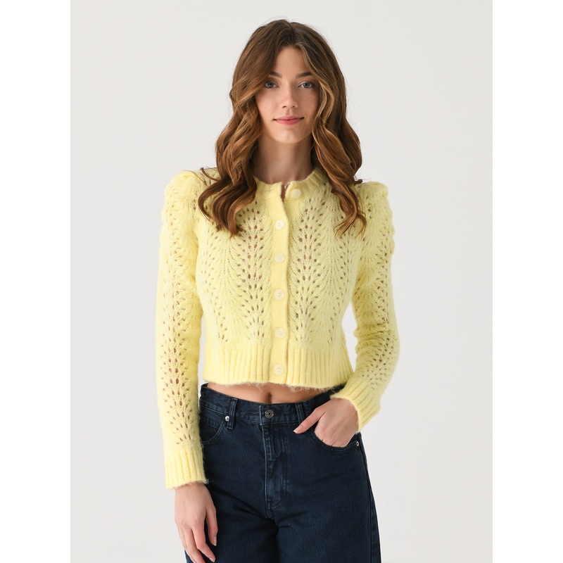 DESCRIPTION:This charming pointelle knit is the perfect blend of comfort and style. The gathered shoulders and shell buttons add a touch of sophistication, while the soft acrylic blend ensures exceptional warmth and a cozy feel.FEATURES:Round NecklineGathe