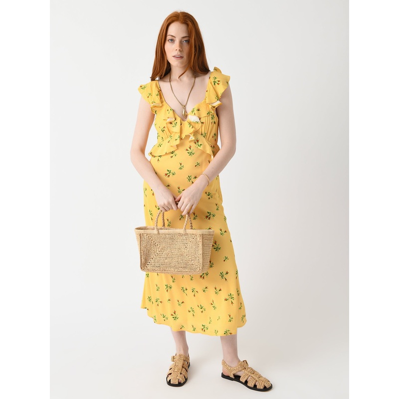 DESCRIPTION:A buttery yellow mid-length dress with a vintage-inspired floral print and a criss-cross ruffle-trimmed bodice.FEATURES:V-NecklineThin, Adjustable StrapsRuffle Trim BodiceSide Zip ClosureBias Cut SkirtMidi SilhouetteAll-Over Novelty PrintLightw