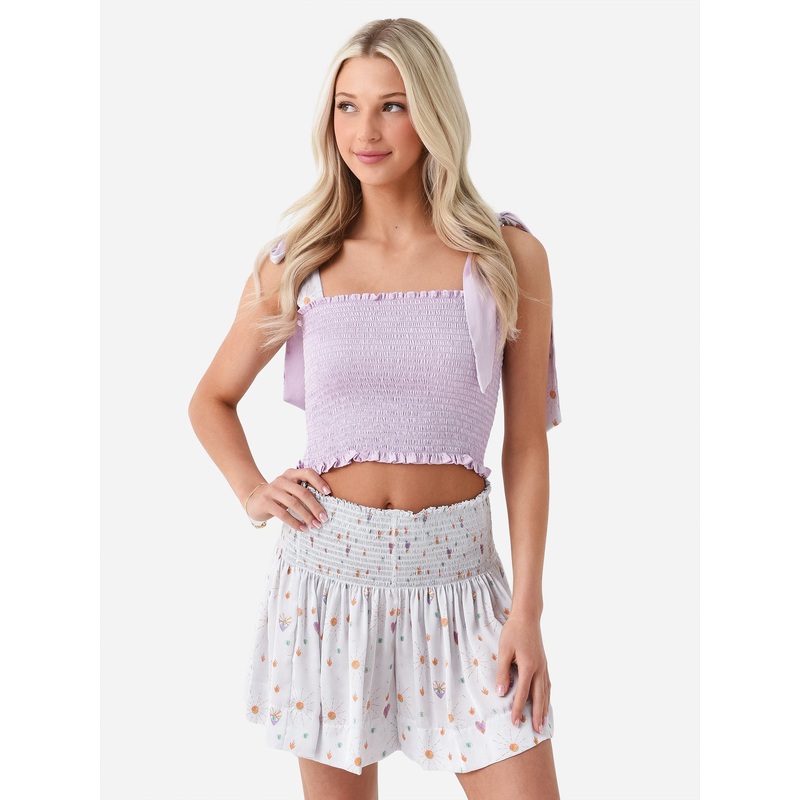 DESCRIPTION:Smocked top with printed tie straps and a slim silhouette.FEATURES:TopSquare NecklineAdjustable Tie StrapsSmocked ConstructionRuffle TrimSlight Cropped SilhouetteSatin FabricationLength: 10.5 in.100% PolyesterSlim FitModel is wearing size Small