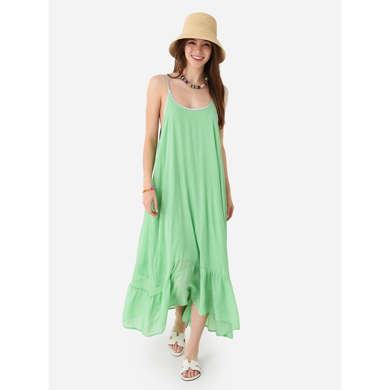 Asymmetrical midi dress with thin straps and a ruffle hem.