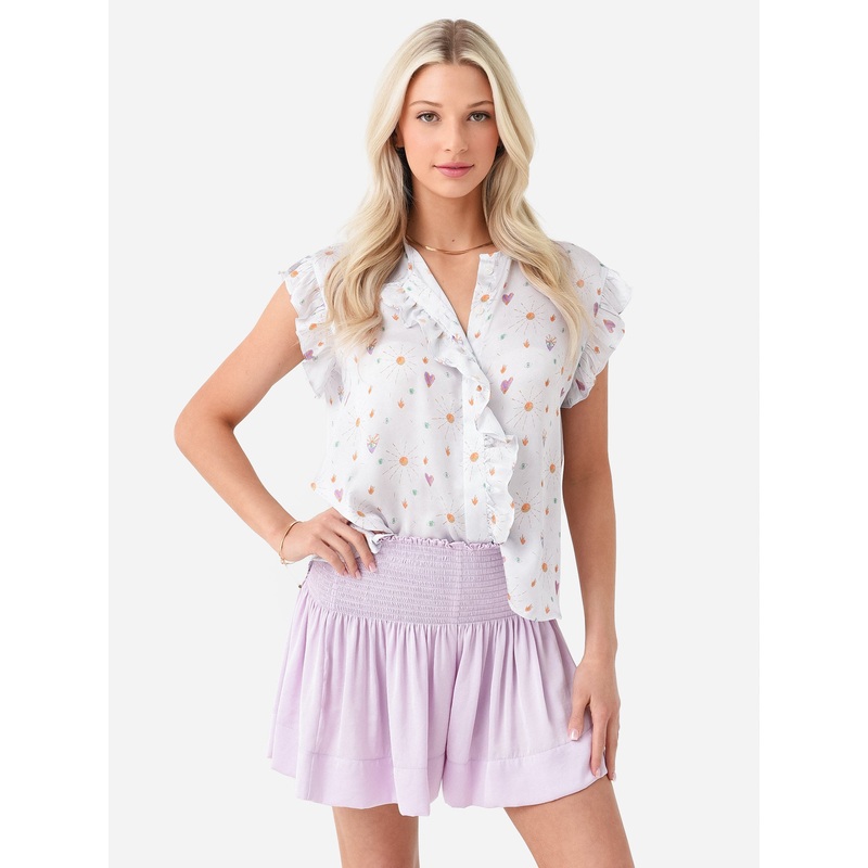 Novelty-printed button-down top with a hidden placket and ruffle trim.