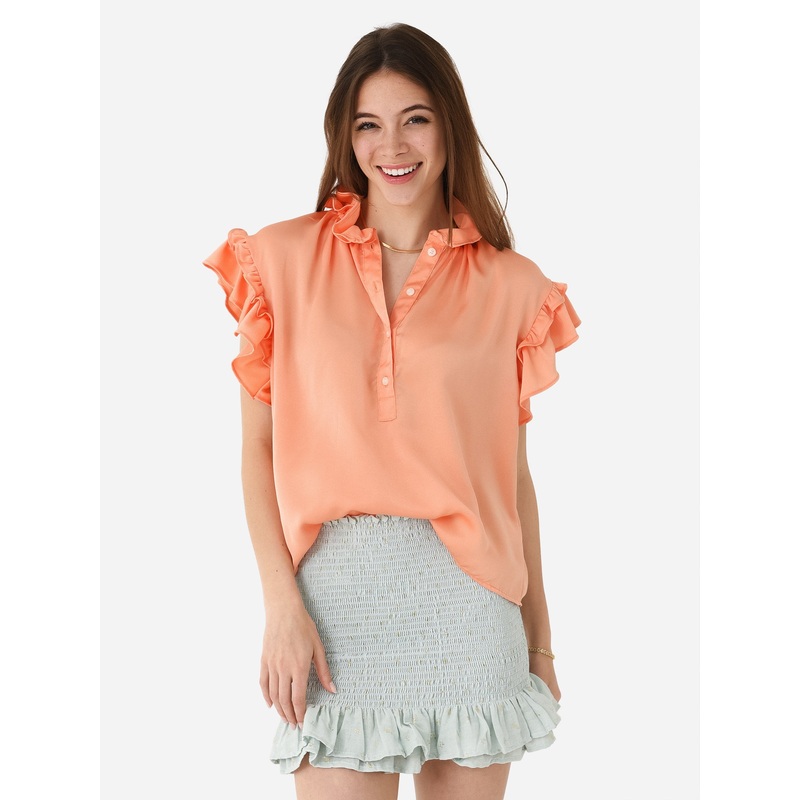 DESCRIPTION:Satin blouse with a ruffle neckline and sleeves.FEATURES:TopRuffle Collar4-Button PlacketShort Ruffle SleeveStraight HemSatin Fabrication100% PolyesterClassic FitModel is wearing size Small top.Model's Measurements: Height: 5'8.5" | Bust: 32B |