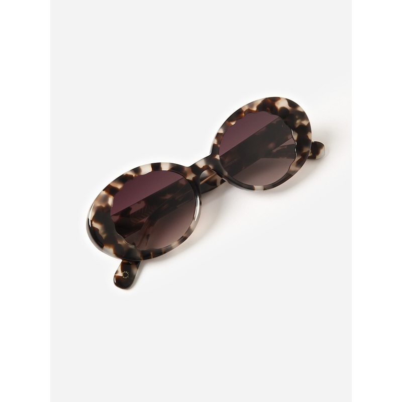 A chic pair of sunglasses with oval-shaped frames and scalloped edging.