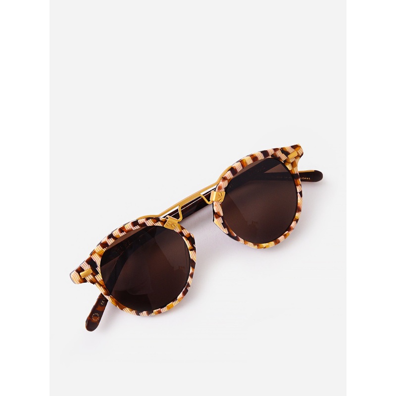 Round fashion sunglasses constructed from acetate and 24-karat gold-plated hardware.