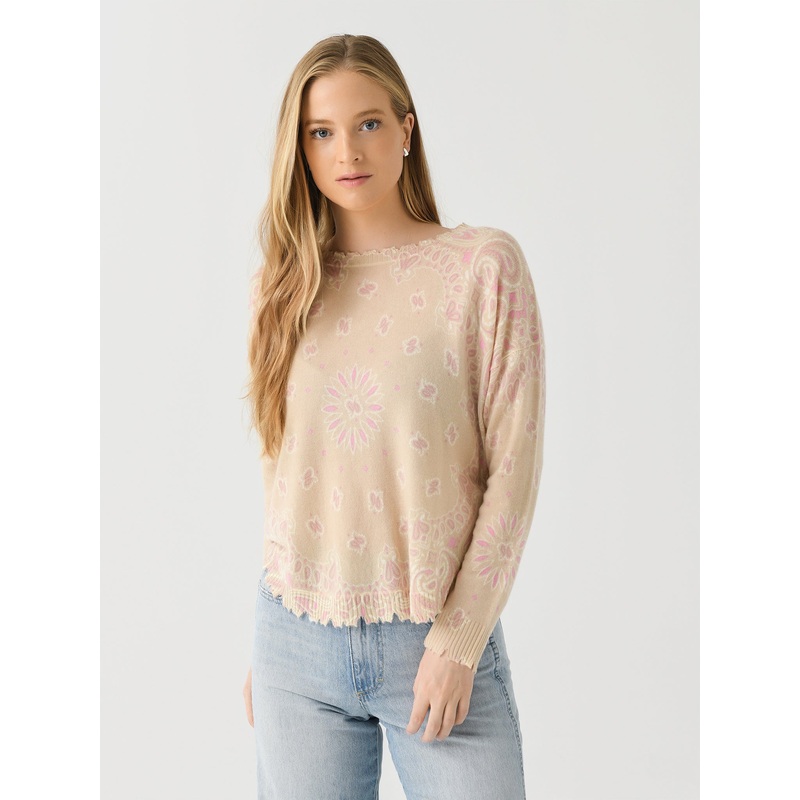 DESCRIPTION:A bandana-printed sweater made from finely knit cashmere and finished with distressed trims.FEATURES:Round NecklineDropped ShoulderDistressed TrimsRibbed Neckline, Cuffs and HemAll-Over Novelty PrintKnit Fabrication100% CashmereClassic FitModel