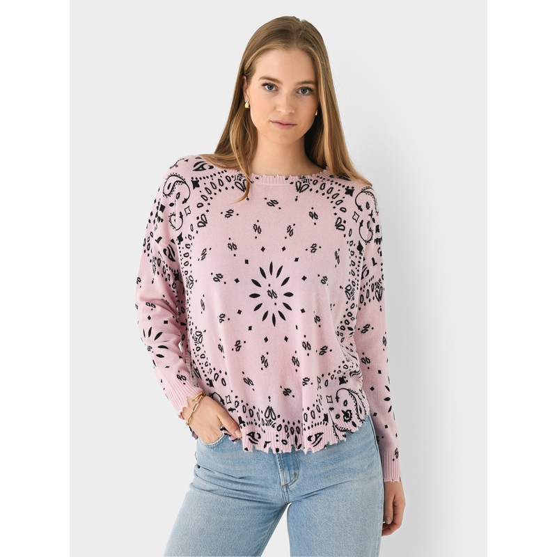 A finely knit cashmere sweater with distressed trims and a bandana print.