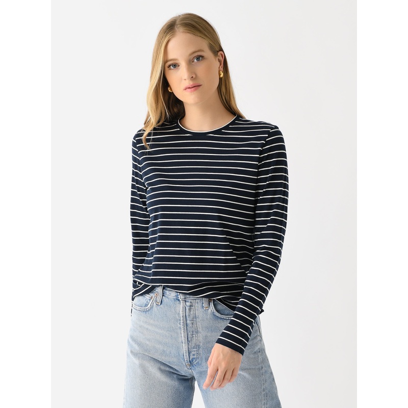 DESCRIPTION:A classic long-sleeve tee made from soft striped cotton.FEATURES:Round NecklineLong SleevesAll-Over Stripe Print100% CottonClassic FitModel is wearing size Small tee.Navy/Cream: Model's Measurements: Height: 5'9.5" | Bust: 32C | Waist: 26.5" |
