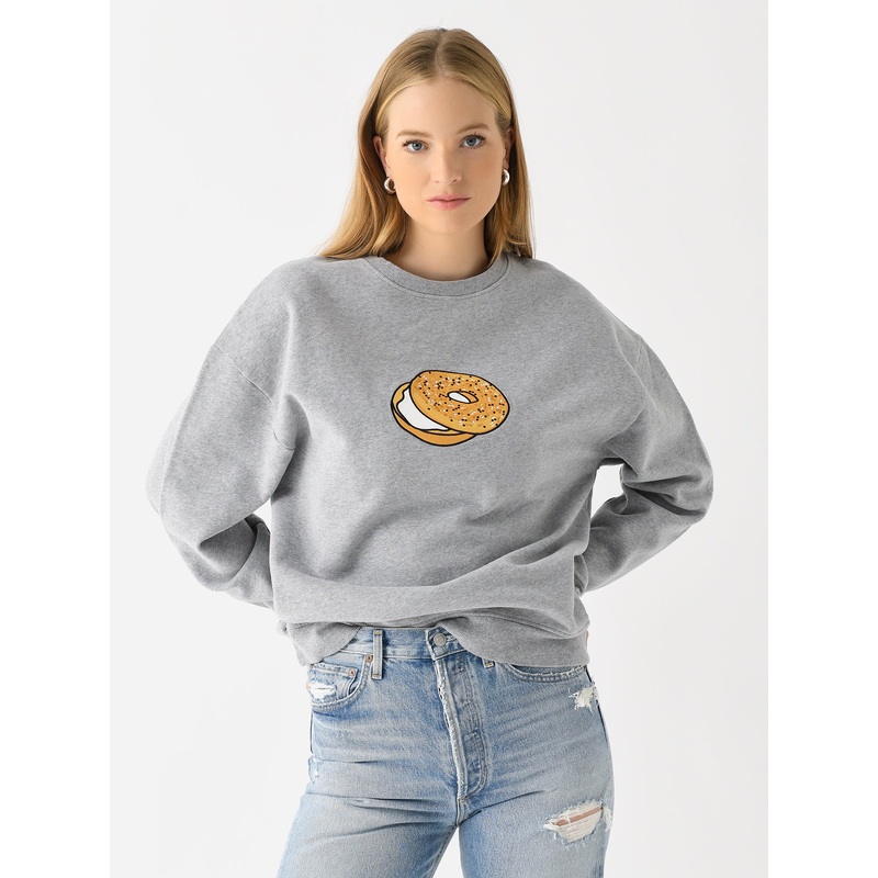 A cozy crewneck sweatshirt featuring a playful embroidered bagel graphic.