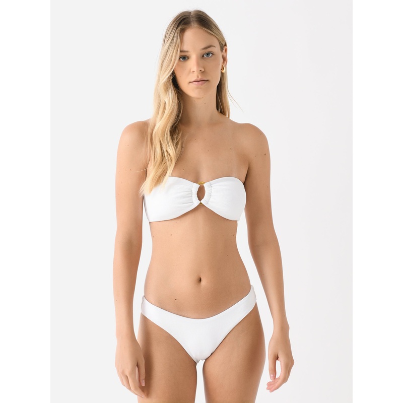 DESCRIPTION:A bandeau bikini top made from soft ribbed fabric with a self-tie back.FEATURES:Strapless NecklineCenter RingBack Tie ClosureLow SupportRibbed Fabrication92% Nylon, 8% SpandexClassic FitModel is wearing size Small bikini top.Model's Measurement