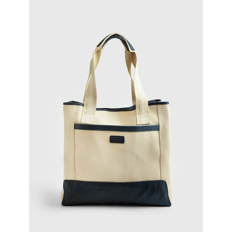 A large tote bag made from durable canvas and finished with neon leather trim details.