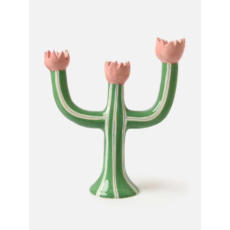 DESCRIPTION:A glazed ceramic candleholder with a tulip design and hand-painted details.