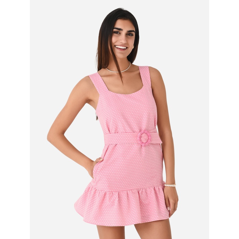 Textured mini dress with a belted waist and feminine ruffle hem.