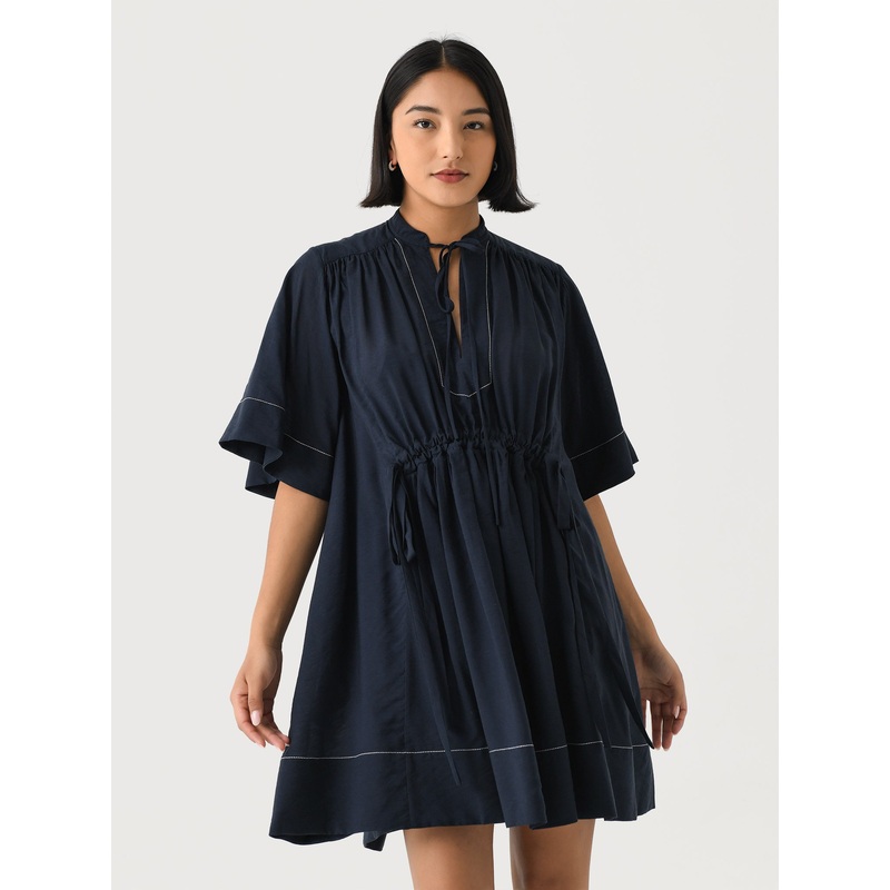 DESCRIPTION:A flowy dress featuring an oversized silhouette with a gathered design and finished with a self-tie neckline, adjustable waist, and topstitching details.FEATURES:Self-Tie NecklineGathered YokeWide SleevesDrawstring WaistSide PocketsHeavy Topsti