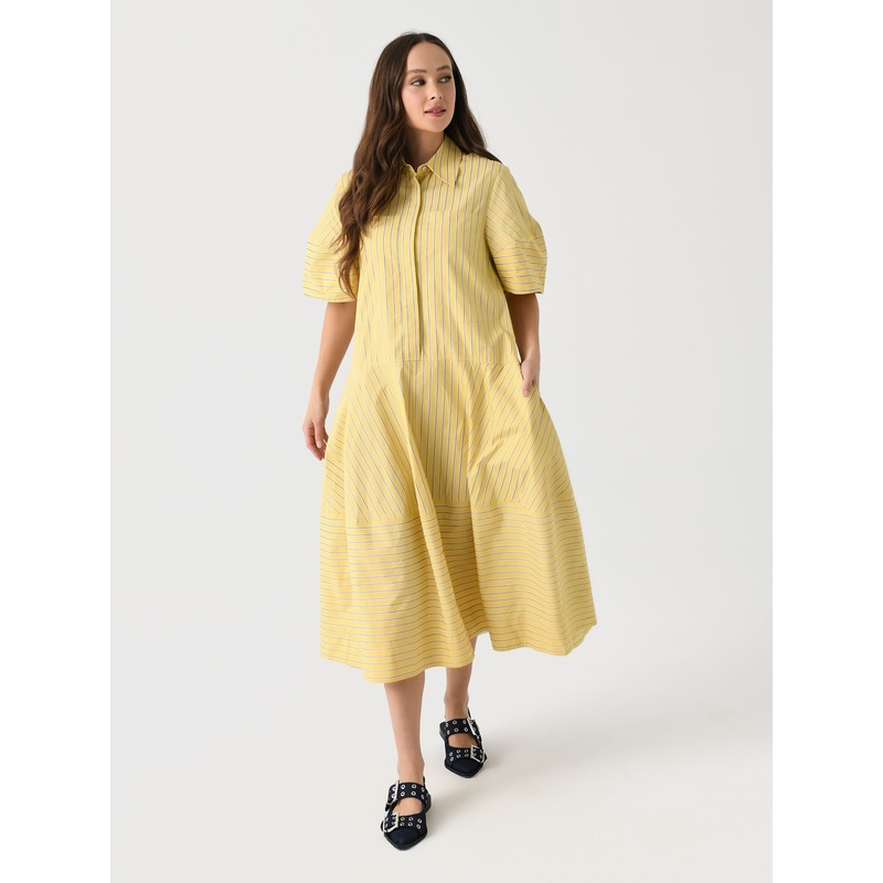 DESCRIPTION:A lightweight cotton blend shirt dress featuring lantern sleeves and a sculptural paneled skirt.FEATURES:Point Collar Chest PocketsHidden Button PlacketLantern SleevesSide PocketsDrop WaistPaneled SkirtMaxi SilhouetteAll-Over Stripe Print72% Co