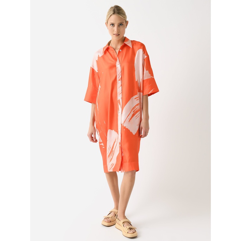 DESCRIPTION:A mid-length shirtdress made from soft silk with a custom-designed print.FEATURES:Point CollarDropped ShoulderHalf-Length SleevesSide PocketsButton-Down FrontSplit HemMidi SilhouetteAll-Over Novelty Print100% SilkRelaxed FitModel is wearing siz