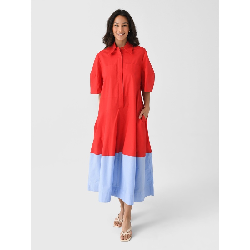 DESCRIPTION:This casual shirtdress is made from lightweight cotton with lantern sleeves and a full skirt with a color block design.FEATURES:Point CollarPuff SleevesChest PocketsHidden Button PlacketSide PocketsFull SkirtColorblock DesignMidi Silhouette100%