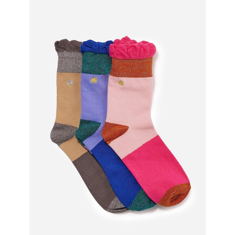 DESCRIPTION:Add some fun flair to your feet with the stunning Lele Sadoughi Set of 3 Ruffle Confetti Socks.FEATURES:Set of 3 Sock PairsCalf HeightRuffle CuffsGlittery Lurex Color BlocksCotton BlendFits Women's Shoe Size 7-10One Size Only