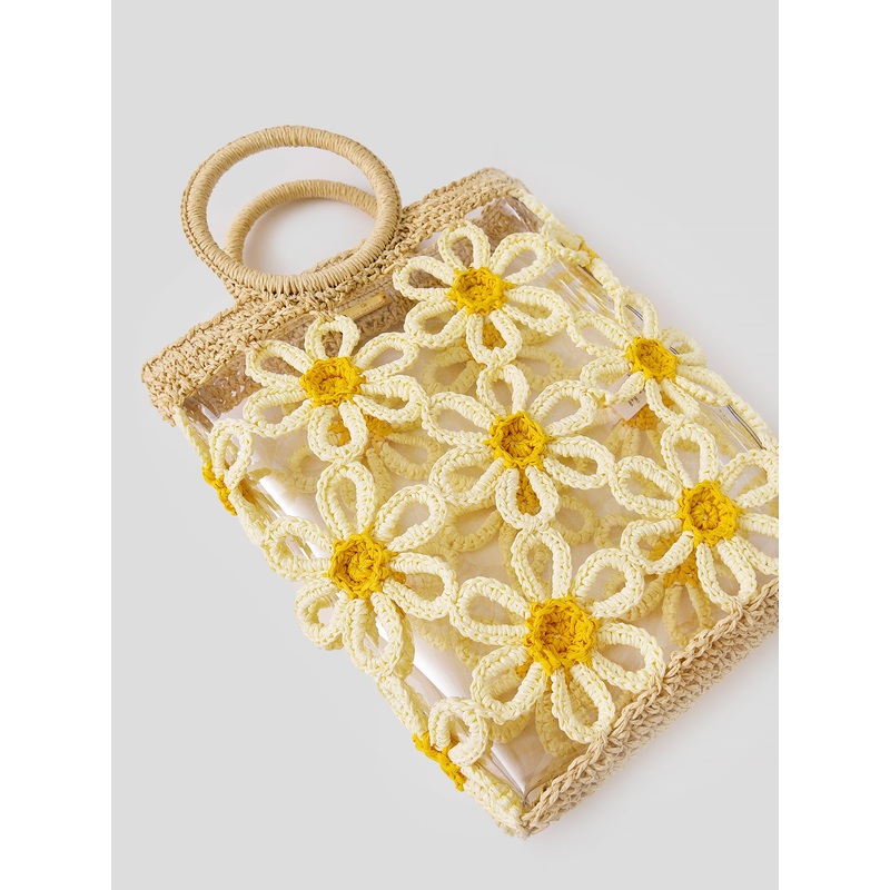 DESCRIPTION:Adorable mini tote with straw crochet daisies.