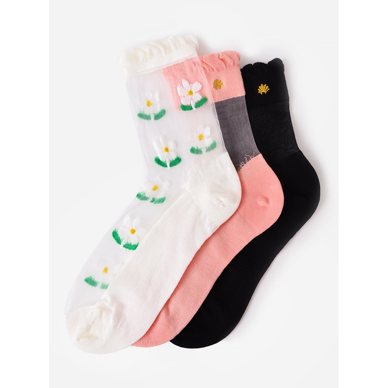 DESCRIPTION:Three pairs of sheer crew-length socks.