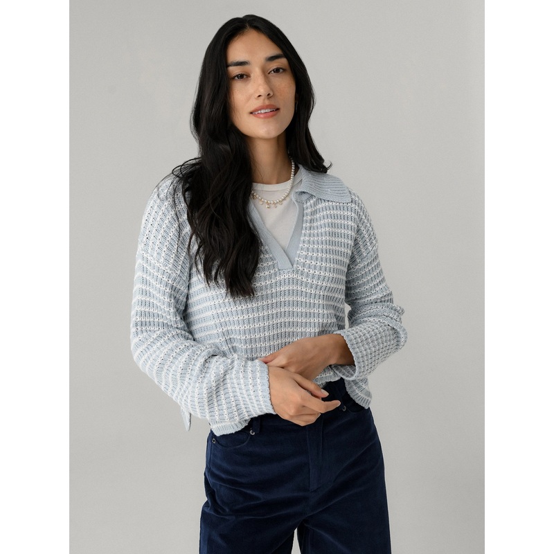 A polo-inspired striped sweater made from a soft cotton knit fabric.