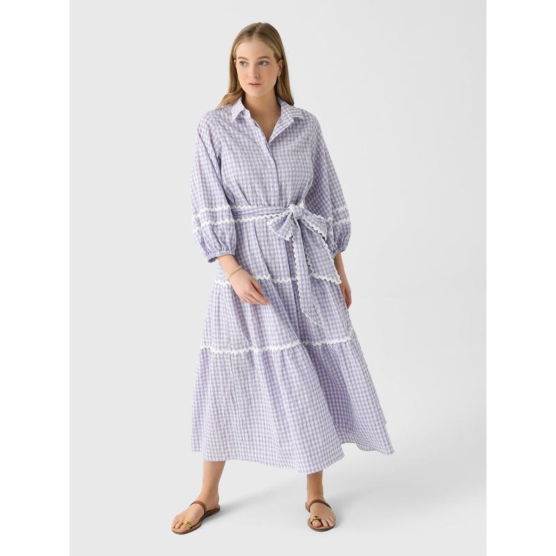 DESCRIPTION:A casual, mid-length dress made from gingham-printed gauze fabric with contrast ric-rac detailing throughout.FEATURES:Spread Collar3/4 Length Puff SleevesHidden Button-Down FrontSelf-Tie BeltContrast Ric-Rac TrimMidi SilhouetteAll-Over Gingham