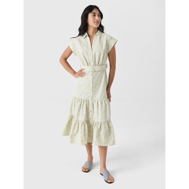 DESCRIPTION:A versatile, mid-length shirt-style dress made from a lightweight cotton blend and finished with cap sleeves and a matching belt.FEATURES:Spread CollarCap SleevesButton-Down FrontAdjustable BeltTiered SkirtMidi Silhouette65% Cotton, 35% NylonCl