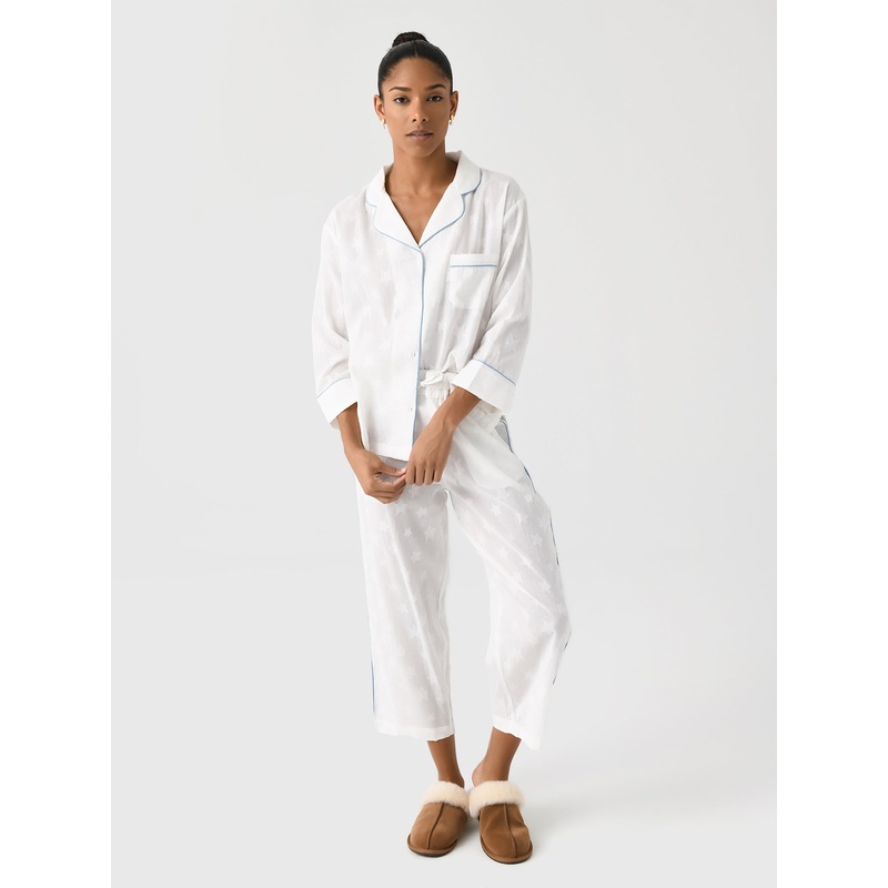 DESCRIPTION:A lightweight pajama set made from dobby cotton fabric adorned with stars and elegantly trimmed with blue piping.FEATURES:Notch CollarLeft Chest Pocket3/4 Length SleevesButton-Down FrontMatching PantAdjustable DrawstringInseam: 24 in. (S)Contra