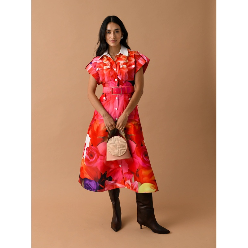 DESCRIPTION:A mid-length shirtdress featuring a jewel-toned floral print and finished with button pockets and an adjustable belt.FEATURES:Spread CollarButton Chest PocketsCuffed SleevesAdjustable BeltSide PocketsButton-Down FrontMidi LengthA-Line Silhouett