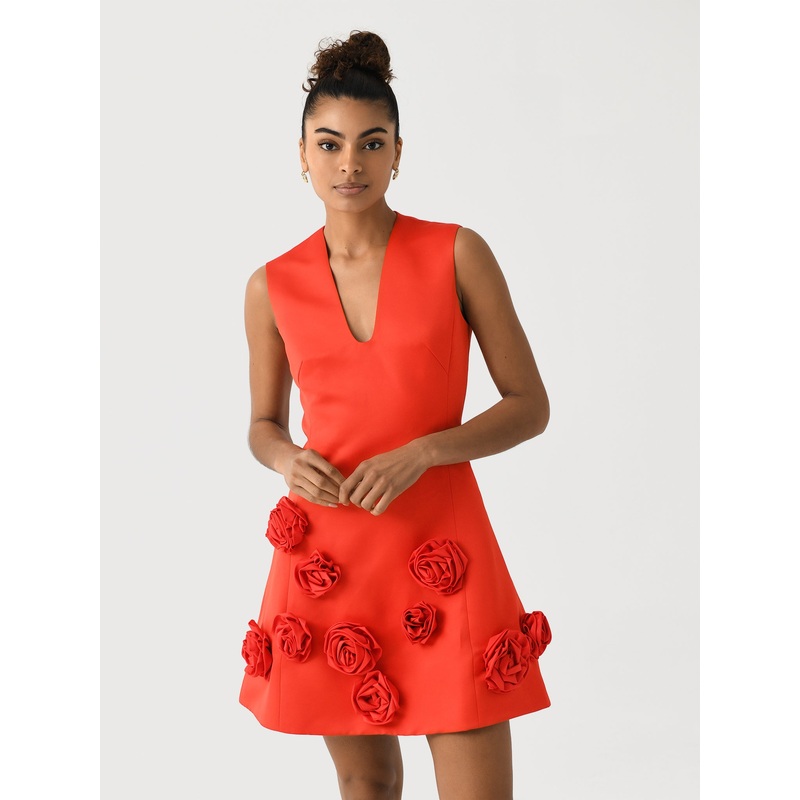 DESCRIPTION:A flattering A-line mini dress with a deep v-neckline and floral appliqu detailing on the lower skirt.FEATURES:V-NecklineBack Zip ClosureSleevelessFloral AppliqusMini LengthA-Line Silhouette100% PolyesterClassic FitModel is wearing size US4/AU8