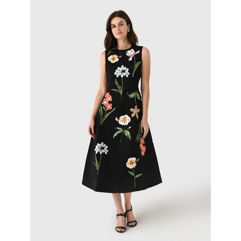 DESCRIPTION:Graceful and refined, this sleeveless midi dress is designed with a classic round neckline and a flattering A-line silhouette. Intricate floral appliqu embroidery brings a touch of enchantment, while delicate beaded embellishments add subtle sh