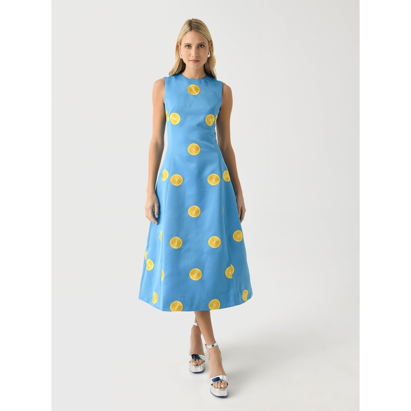 This flattering A-line dress features a fitted bodice, a full skirt, and an embroidered citrus print.