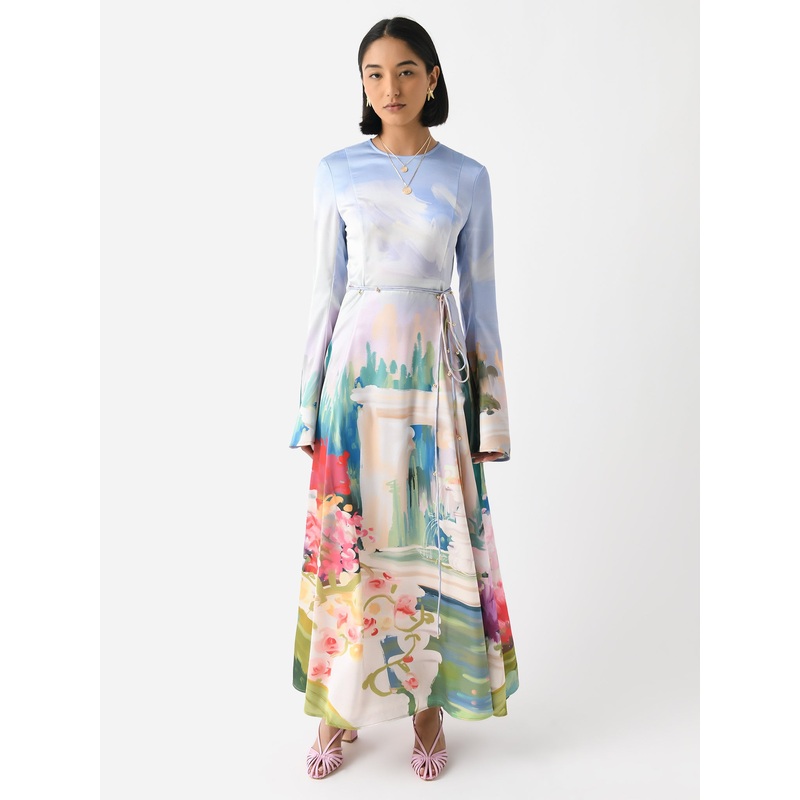 A flowy, maxi-length dress with bell sleeves and a custom garden print inspired by the Garden of Versailles.