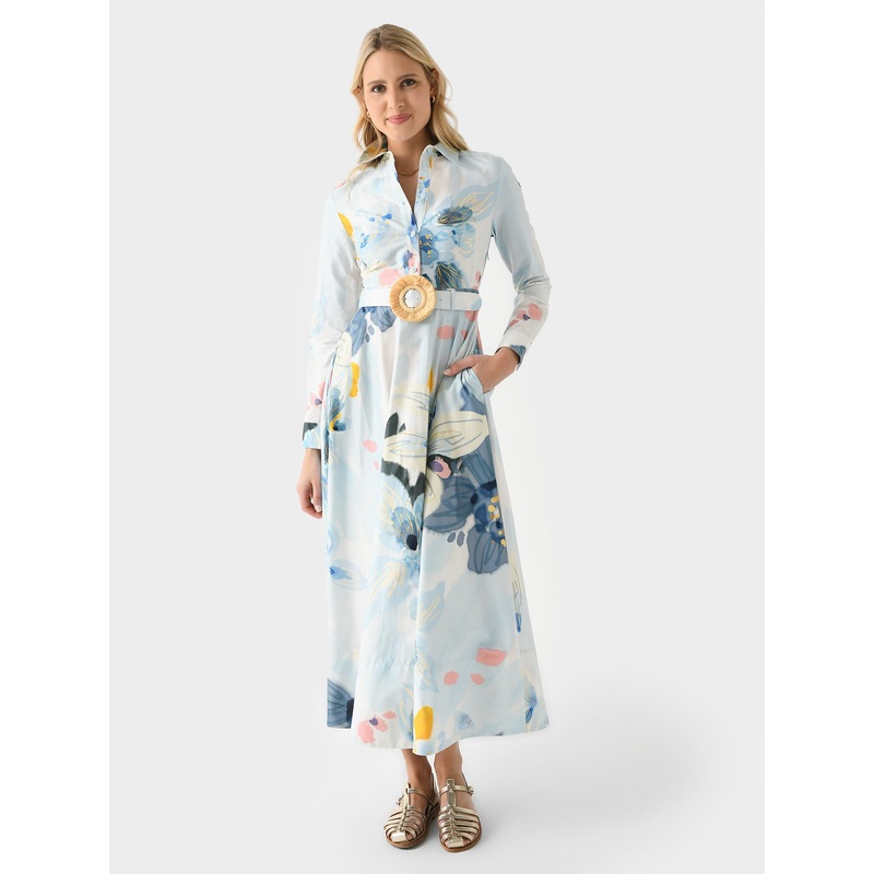 DESCRIPTION:A mid-length shirt-style dress made from lightweight cotton with a flattering a-line silhouette.FEATURES:Point CollarButton CuffsPartial Button PlacketSide Zip ClosureAdjustable BeltSide PocketsMidi LengthA-Line SilhouetteAll-Over Novelty Print