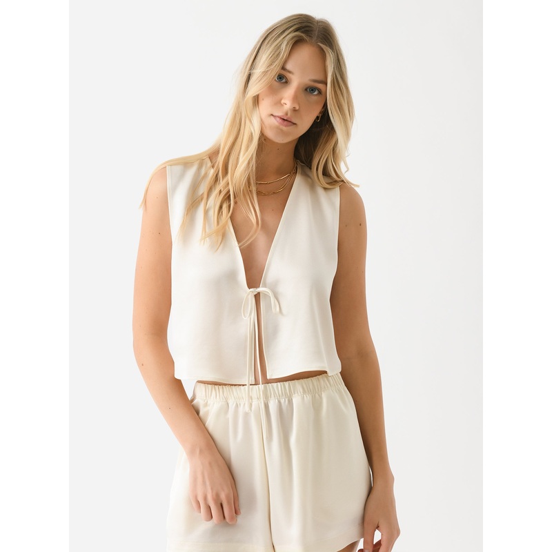 DESCRIPTION:A satin crop top with a delicate tie closure and deep v-neckline.FEATURES:Deep NecklineSleevelessFront Self-TieCropped SilhouetteSatin Fabrication76% Tri-Acetate, 24% PolyesterClassic FitModel is wearing size Small top.Model's Measurements: Hei