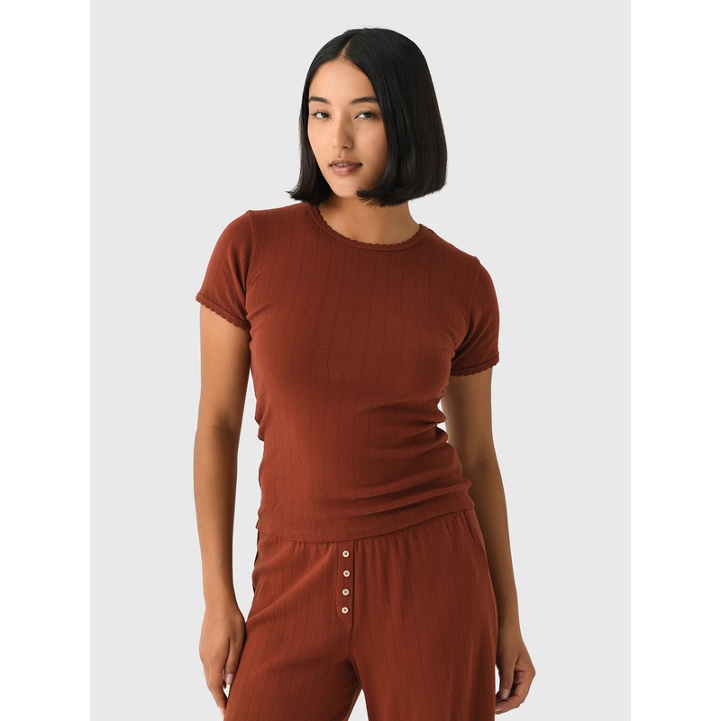DESCRIPTION:A slim-fitting crewneck tee constructed from soft cotton pointelle fabric.FEATURES:Crew NecklineShort SleevesScalloped TrimsPointelle Knit Fabric100% CottonSlim FitModel is wearing size Small tee.Cinnamon: Model's Measurements: Height: 5'8" | B
