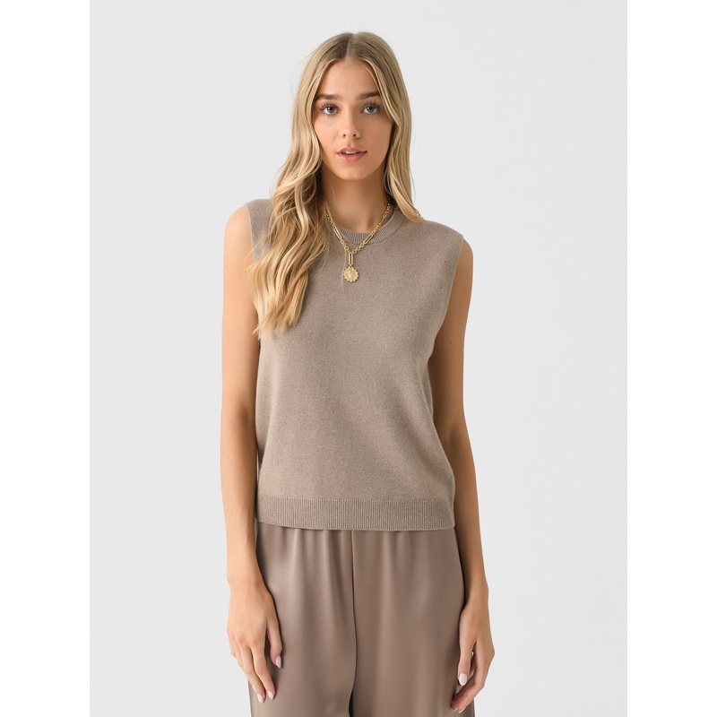 A sleeveless crewneck sweater made from a finely knit blend of wool and cashmere.