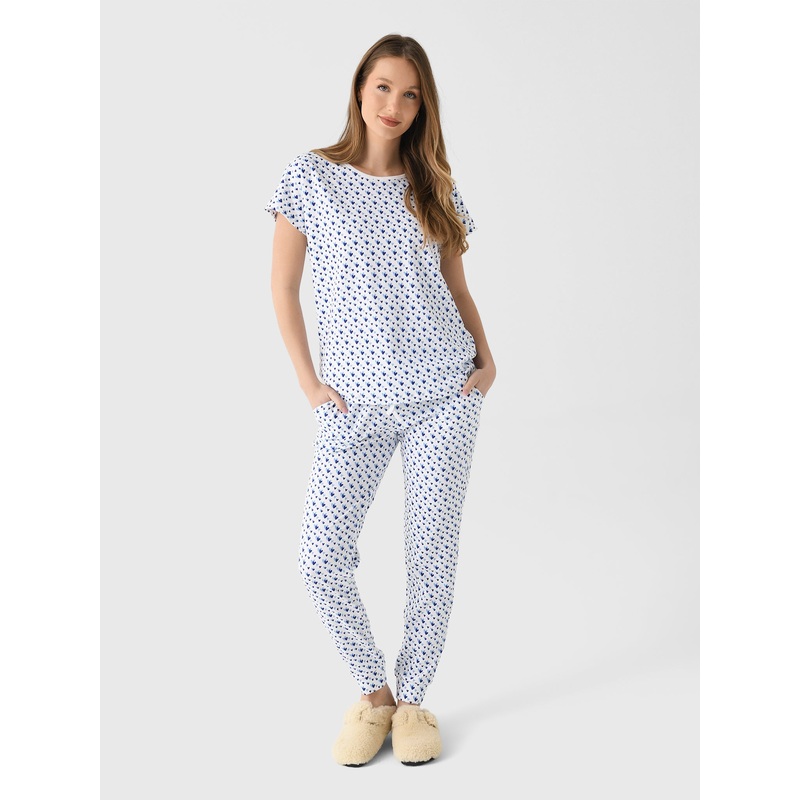 DESCRIPTION:A short-sleeve top and jogger pant pajama set made from soft Pima cotton with a custom print.FEATURES:Round NecklineShort SleevesMatching PantDrawstring WaistBanded Ankle CuffsAll-Over Novelty Print100% CottonRelaxed FitModel is wearing size Sm